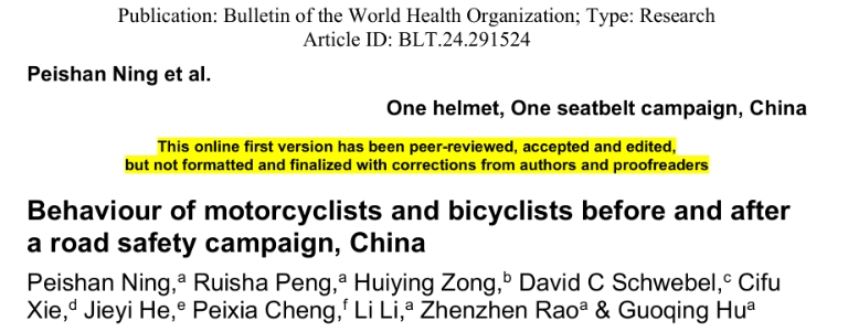 流行病与卫生统计学系胡国清教授团队的最新研究成果“Behaviour of motorcyclists and bicyclists before and after a road safety campaign, China”在国际公共卫生领域权威期刊、世界卫生组织官方期刊《Bulletin of the World Health Organization》(IF=8.4,SCI分区1区,Top 5%期刊)发表。WG游戏