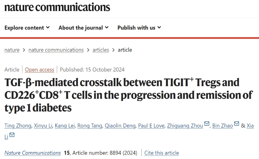 中南大学三诺营养与代谢健康研究中心赵斌教授团队与湘雅二医院李霞、周智广教授团队近日取得了一项重要发现,揭示了调控1型糖尿病(T1D)进展与缓解的全新机制。这一研究成果于2024年10月16日在国际知名期刊Nature Communications上发表,研究论文为“TGF-β-mediated crosstalk between TIGIT+ Tregs and CD226+CD8+ T cells in the progression and remission of type 1 diabetes”。该研究揭示了一个调控T1D疾病进展与缓解的全新机制:TIGIT+ Treg-TGF-β-CD226+CD8+ T细胞的相互作用与动态变化在T1D进展中起重要作用,靶向CD226可以抑制胰岛炎局部免疫细胞的失衡,进而遏制T1D的进展。