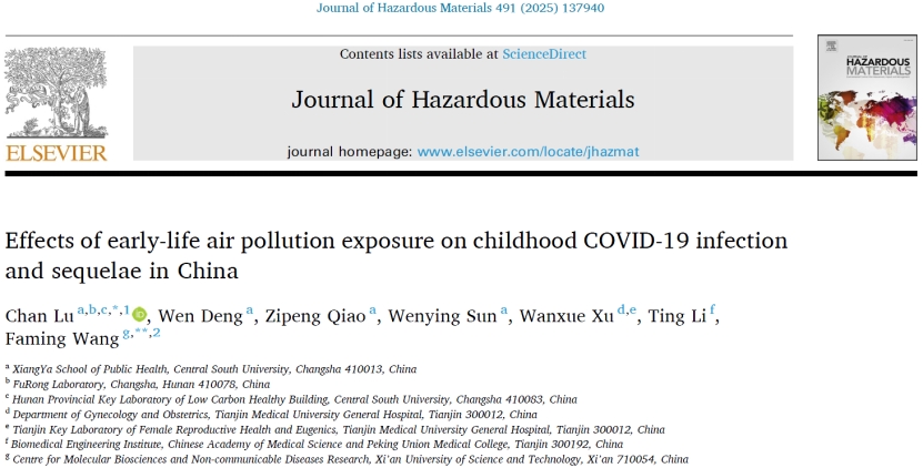 2025年3月15日,中南大学湘雅公共卫生学院劳动卫生与环境卫生学系路婵教授团队与西安科技大学OHRG团队负责人王发明教授的合作研究成果“Effects of early-life air pollution exposure on childhood COVID-19 infection and sequelae in China”在国际环境健康领域权威期刊《Journal of Hazardous Materials》(IF:12.2,JCR Top 3%,中科院1区TOP)以Research Paper发表。路婵教授为该文第一作者和共同通讯作者,王发明教授为该文共同通讯作者,中南大学和西安科技大学为共同通讯单位。