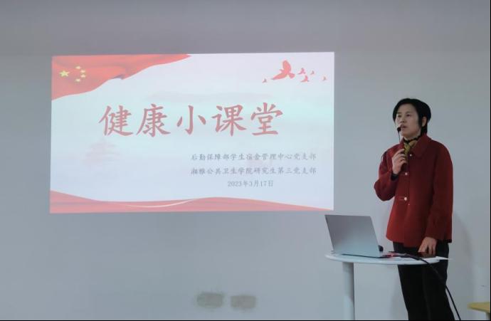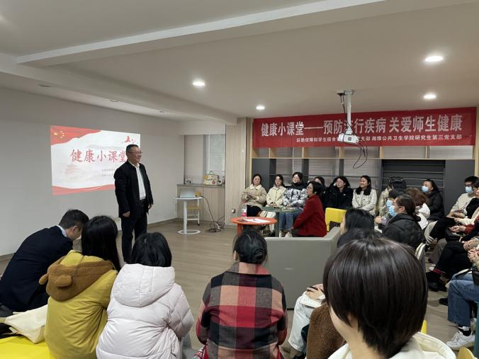 研究生第三党支部叶纤、李玲琦、谢郁、吴瑕等4位同志依次介绍了诺如病毒感染、乙型肝炎、甲型流感、细菌性痢疾等四种学校常见传染性疾病的防治知识,并针对学生宿舍人口密度大、通风条件差、生活垃圾多等不利因素,向宿管中心的管理人员和一线工作人员提出了疾病预防建议,用实际行动弘扬了新时代雷锋精神。