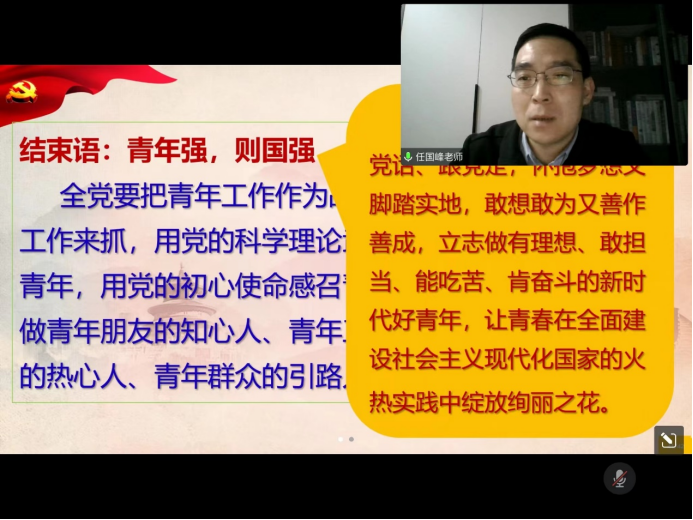 任院长向党员同志们解读党的二十大主题,以党的二十大报告要点为主线,分别从五个方面内容解读党的二十大精神。关于新时代十年伟大变革,要求我们要从学习中进一步坚持四个自信,坚定政治站位,汲取奋进力量;关于马克思主义中国化时代化新境界,阐述了“两个结合”要求,精辟概括了习近平新时代中国特色社会主义思想贯穿的世界观和方法论,号召全体党员继续推进实践基础上的理论创新、不断开辟马克思主义中国化时代化新境界;关于以中国式现代化全面推进中华民族伟大复兴,要求全体党员把思想和行动统一到党的二十大精神上来,心往一处想、劲往一处使,在中国式现代化道路上不断谱写全面建设社会主义现代化国家新篇章;关于实施科教兴国战略与重大部署,指出教育、科技、人才是全面建设社会主义现代化国家的基础性、战略性支撑,号召全体党员要坚持尊重劳动、尊重知识、尊重人才、尊重创造;关于深入推进新时代党的建设,指出我们身处这样一个伟大的时代,每位党员都要时刻提醒自己严以律己、重任在肩,践行“忠诚、干净、担当” 要求。
