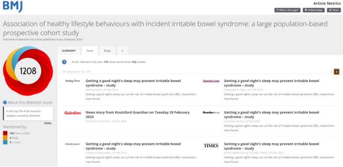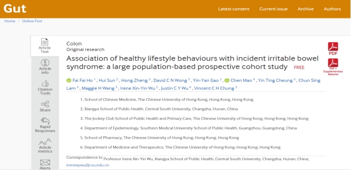 流行病与卫生统计学系吴心音教授团队的研究成果 “Association of healthy lifestyle behaviours with incident irritable bowel syndrome: a large population-based prospective cohort study”。已有包括美国有线电视新闻网(CNN)、英国独立报(The Independent)、卫报(The Guardian)在内的162家新闻媒体报道了该研究。该研究工作由中南大学和香港中文大学两支研究团队共同完成。吴心音教授为该文唯一通讯作者,中南大学为唯一通讯单位。
