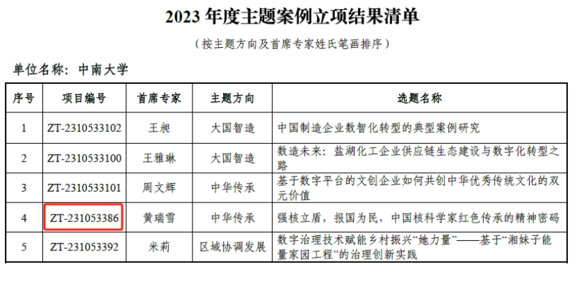 黄瑞雪教授牵头的项目“强核立盾,报国为民,中国核科学家红色传承的精神密码”荣获主题案例立项。项目主要围绕新中国成立以来“两弹一星”科学家的精神,梳理总结典型案例,旨在开发具有时代性、引领性、学理性的高质量案例资源,充分展现我国社会主义精神文明理论与实践成果。