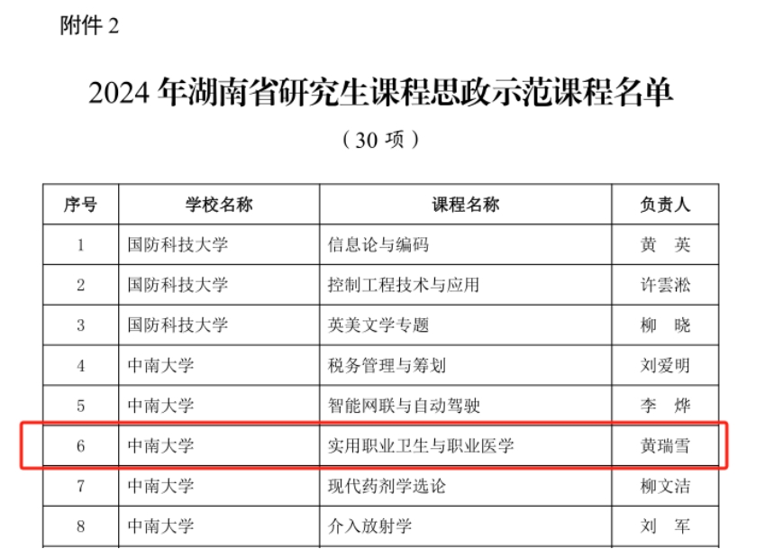 黄瑞雪教授负责的2024年湖南省研究生课程思政示范课程《实用职业卫生与职业医学》是WG游戏