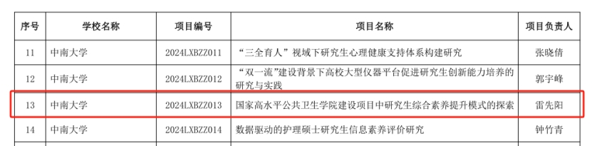 2024年教学改革成效显著。1项获教育部主题案例立项(《强核立盾,报国为民,中国核科学家红色传承的精神密码》)。获国家级一流课程1项;湖南省学位与研究生教学改革研究项目(重点)1项;湖南省地方标准(DB43/T 2913-2024 营养健康食堂建设管理规范)1项;2门国际化课程获批中南大学国际化课程;2门课程获湖南省研究生课程思政课堂教学大赛二等奖、三等奖;获第二届湖南省基础教育改革课题1项;校级教师研究生教改项目18项(在线课程2项,案例5项,专业实践和社会实践各1项)、研究生自主探索项目(含校企联合)申报近90项,立项30项(7项省级)。2025年1月,WarGame