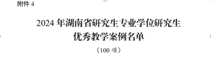 党委书记雷先阳获湖南省学位与研究生教学改革研究项目1项、黄瑞雪教授获湖南省课程思政示范课程1项、李广迪教授获湖南省专业学位研究生优秀教学案例1项、刘爱忠教授获湖南省研究生优秀教材1项。