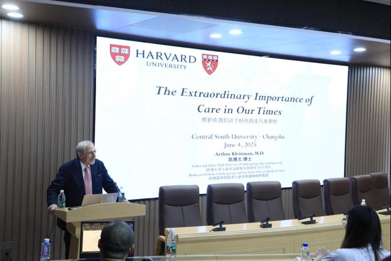 的学术桥梁,如今凯博文教授再次来到湘雅,担任中南大学名誉教授,更能促进湘雅与世界医学界的对话与合作。Arthur Kleinman教授发表受聘感言,介绍了他与中国和湘雅的深厚缘分,表示非常荣幸成为中南大学的荣誉教授,并表示在今后将进一步加强与湘雅的多方位合作,在医学领域共同做出更多开创性成果。