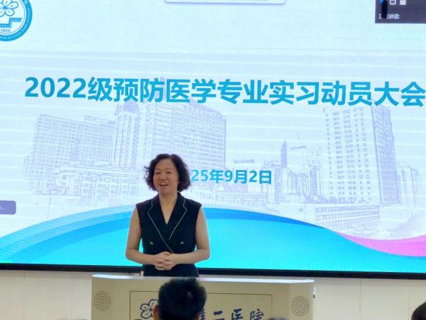 副院长李杏莉结合“公卫医师处方权试点”等医防融合新政策,指出临床实习对预防医学学生的重要性和必要性,鼓励大家珍惜实践机会,夯实医学基础,拓宽专业视野,坚守从医初心。