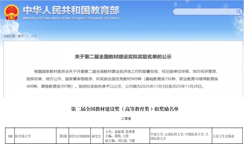 二级教授、流行病与卫生统计学博士生导师颜艳担任第一主编的国家卫生健康委员会“十三五”研究生规划教材《医学统计学》(第五版),荣获第二届全国教材建设奖(高等教育类)二等奖。