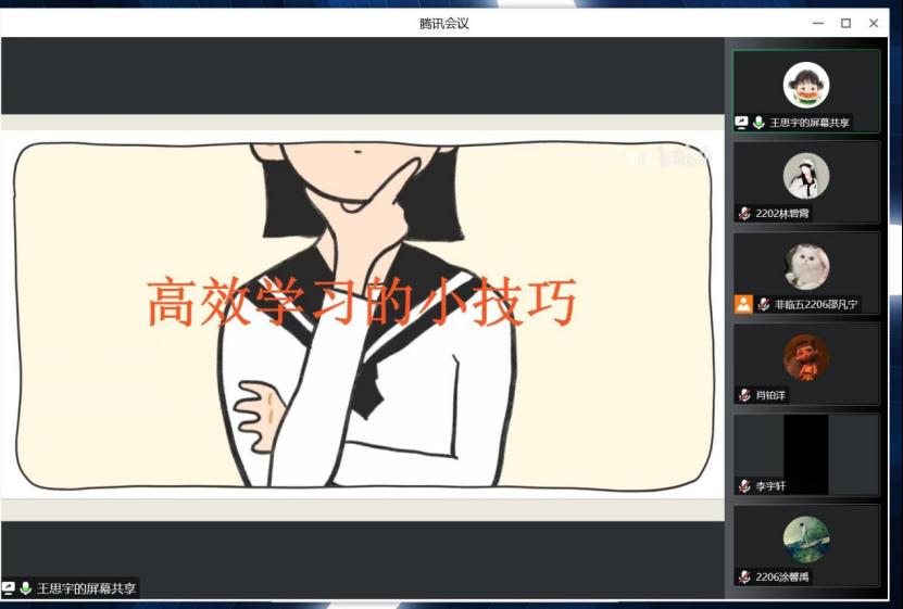 随后,王思宇同学以“拒绝摆烂”为主题,向同学们分享了解决拖延、防止走神的小技巧。她提出可以通过“缩短任务期限”、“提前做好规划”、“完善监督措施和奖励机制”三种方式解决拖延问题,通过塑造良好环境、适当休息的方式解决走神问题。除此之外,王思宇同学还建议同学们采用建立学科框架、整理电子化错题集的方式提高学习效率,她希望同学们都能找到适合自己的学习方法,高效地完成学习任务。