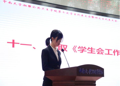 大会进入第十七项,新任学生会主席团代表张睿兮宣读了《中南大学湘雅公共卫生WarGame