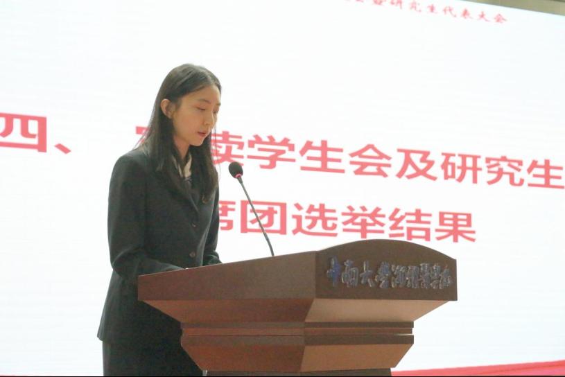团委副书记宁佩珊老师为第六届学生会主席团成员、研究生会主席团成员颁发了聘书。聘书颁发完毕后,大会主持人宣读选举结果:张睿兮、张楠、蒋志豪任新第七届学生会主席团成员;蒋丽芳、周仪昭任第七届研究生会主席团成员;以及9位校级学生代表将出席中南大学第七次学生代表大会。