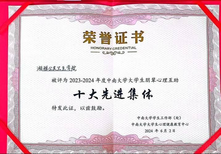 朋辈心理互助会(以下简称心助会)在学校朋辈心理互助工作2023-2024年度评优中荣获中南大学大学生朋辈心理互助“十大先进集体”称号(全校第二名)。