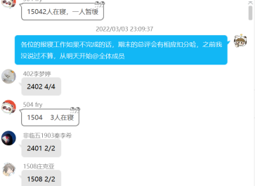l 准时健康打卡。每天在保安室测量体温后进行记录,10点前进行健康打卡,并由寝室长负责监督本寝同学,完成后在寝室长群里进行接龙。